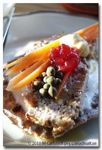 Riv svartpeppar över ytan. Servera varmt, gärna med en kall sås och grönsaker.